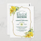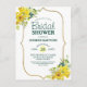 Cette jolie carte postale d'invitation de douche de mariée au motif floral jaune printanier frais et élégant est parfaite pour les douches de mariée de printemps et d'été. Le design présente des fleurs vives jaunes et bleues avec des accents de verdure botanique. Un cadre doré entoure élégamment l'invitation à la douche. Le dos de la carte a un fond jaune citron doux avec des pois blancs. Cette invitation de douche de mariée sous forme de carte postale est si douce et élégante pour votre événement de mariage avec vos amis et votre famille.