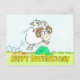 Cette mignonne carte de fête des pères dessinée dans un style de dessin animé montre un bélier sautant au-dessus d'un buisson vert sur un pré, devant un ciel bleu. Le mouton mâle a deux petits agneaux sur le dos qui sont clairement en train de s'amuser avec leur père. Sous eux, sur le gras, les mots "Fête des pères heureuse" sont écrits en caractères jaunes gras.