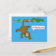 Un singe de dessin animé, accroché à une branche d'arbre par sa queue. Il tient une banane dans chaque main. L'image a un arrière - plan bleu vif et le singe dit 'Joyeux Jour du Singe'.