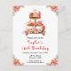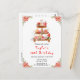 Cette invitation d'anniversaire élégante et festive comprend un stand de gâteaux avec des biscuits de pain d'épices, des macarons, des bonbons, du cacao chaud et une théière. Dans les coins sont de belles fleurs de poinsettia rouges. Le texte combine écriture manuscrite et polices sans serif pour un look élégant et moderne. C'est parfait pour un brunch de Noël d'anniversaire ou une fête du thé.