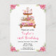 Cette invitation d'anniversaire élégante et festive comprend un stand de gâteaux avec des biscuits de pain d'épices, des macarons, des bonbons, du cacao chaud et une théière. Dans les coins sont de belles fleurs de poinsettia roses. Le texte combine écriture manuscrite et polices sans serif pour un look élégant et moderne. C'est parfait pour un brunch de Noël d'anniversaire ou une fête du thé.