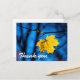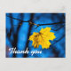 Image d'une seule feuille d'érable jaune sur une brindille contre l'arrière - plan bleu foncé. Merci de texte blanc dans la zone inférieure gauche. Carte postale personnalisable unique. Le texte modèle Tout notre amour et merci à vous et à votre famille. Andersons au verso de la carte. Vous pouvez modifier ou supprimer le texte du modèle à l'avant et à l'arrière.
