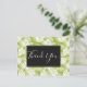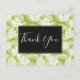 Une carte de remerciement avec un motif répétitif de grandes feuilles de palmier sur fond vert olive. Message personnalisé au verso.