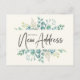 Jolies feuilles d'eucalyptus vert et verdure sur une carte postale de changement d'adresse/d'annonce de déménagement de couleur crème pour informer tous vos amis et votre famille que vous avez déménagé.