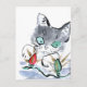Lien, Lien... Le chaton gris est très perplexe au-dessus des lumières de Noël clignotantes rouge et vert pour l'arbre de Noël. Sumi-e, peinture à l'encre japonaise en couleur. Artiste Ellen Miffitt @ Nine Lives Studio