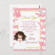 Jolie fille aux cheveux bruns rose sainte première communion design avec fond rayé rose et confettis en feuille d'or. Créations de Mujka et KlouiseDigiArt sur Etsy.