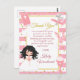 Conception de première communion sainte rose fille aux cheveux noirs avec fond rayé rose et confettis en feuille d'or. Créations de Mujka et KlouiseDigiArt sur Etsy.