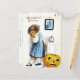Illustration vintage d'Halloween montrant une fille et Jack o'Lantern avec l'inscription "Les discours et les sorcières sont occupés à la nuit, soucieux de mettre de bons enfants à la peur ; Unissons-nous pour écarter le charme, rire et être joyeux, et oublier toute alarme."