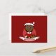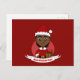 Carte postale avec l'illustration d'une mignonne fille afro-américaine souriante aux cheveux noirs courts, la fille porte un costume de Père Noël avec un casquette rouge et tient un cadeau ; dans un cercle rouge sur un arrière - plan rouge, avec un modèle texte modifiable pour votre nom ou message