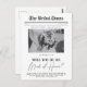 Quand il est temps pour votre proposition de Maid of Honor, cette carte postale tendance du journal est le sentiment parfait. Avec le texte "Serez-vous ma femme d'honneur ?" dans un style minimaliste noir et blanc avec la tête de masque "The Bridal Times". Gardez cette photo, ou échangez-la pour l'une des vôtres ! Ce design élégant donne une touche personnelle à votre proposition de bridemaid. Facile à customiser avec le nom de votre ami et un message personnel.