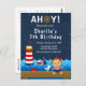 Cette invitation mignonne et amusante présente une fille marin singe nautique sur un pont en bois avec une mouette et un crabe. En arrière-plan, il y a un phare rouge et blanc, un oiseau mignon sur un voilier, des vagues océaniques et un ciel nocturne étoilé bleu marine. Le texte combine des polices grasses et serif pour un look élégant et moderne. C'est parfait pour une fête d'anniversaire sur le thème nautique.