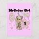 Un singe-fille entouré de ballons roses et de fleurs est assis sur des cadeaux d'anniversaire et le texte dit "Fille d'anniversaire 1" sur les t-shirts d'anniversaire du singe 1er, costumes, cartes, sacs fourre-tout, magnets, et plus.