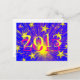 Un feu d'artifice explosant sous une pluie d'étoiles dorées et roses éblouissantes contre un ciel bleu. Carte postale avec un design personnalisable jaune, rose, bleu et blanc pour vous permettre de personnaliser avec votre propre texte, photos et idées. Le texte peut facilement être modifié à l'aide du modèle fourni ou cliquez sur le bouton "Customiser" pour effectuer d'autres modifications. Créé à l'aide de photographies originales et de techniques numériques de Jess Perry.