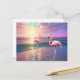Une scène de plage imaginaire avec deux beaux flamands roses avec un beau coucher de soleil en arrière - plan sur un bel océan calme.