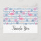 Carte de remerciement - un motif avec une ambiance estivale amusante. Des flamants roses et des ananas sur un fond rayé bleu clair avec des feuilles et des cœurs tout autour.