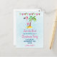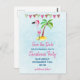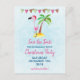 Enregistrez la carte postale de la fête de Noël Date. Une jolie illustration d'un flamant rose portant un chapeau de santa rouge. Posé sur un monticule de sable avec un palmier tropical derrière. Banderole rose et verte sur le dessus et posée sur un arrière - plan bleu clair.