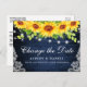 Moderne Elégante aquarelle tournesol floral et vert changement La carte postale Date Mariage postponement présente tournesol et verdure sur bois bleu rustique avec des lampes à cordes et dentelle.