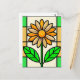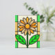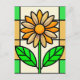 un vitrail illustrant une marguerite jaune et blanche aux feuilles verts.