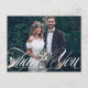 Fleurissement de script élégant Photo mariage blanc Merci Carte postale | Remerciez votre famille et vos amis d'avoir partagé votre jour spécial avec cette carte de remerciement personnalisable. Elle présente un lettrage "merci" superposé et une typographie serif.