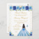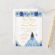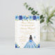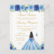 Cette invitation élégante et glamour pour un sweet sixteen anniversaire présente une belle princesse avec des cheveux noirs et une peau foncée dans une robe de bal bleue. Le texte combine une écriture manuscrite et des polices modernes sans serif pour un look classe et sophistiqué. Les arrangements floraux, les papillons et les confettis dorés créent le mélange parfait de rustique et de chic. Graphiques par www.etsy.com/uk/shop/SunflowerDayLove