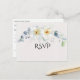 Une belle carte RSVP mariage sur un arrière - plan blanc avec une fleur d'aquarelle bleue et blanche Cette RSVP fait partie d'une suite de produits qui correspondent au design. Ce design est parfait pour un mariage plus élégant dans une église.