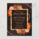 Magnifique conception florale aquarelle champêtre de fleurs automnales orange brûlé avec une bordure en feuille d'or et des guirlandes lumineuses sur un fond en bois brun