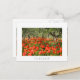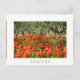 Photo carte postale d'un champ avec des fleurs de pavot rouge sous d'anciens oliviers dans un verger de la campagne italienne en été avec une frontière blanche et le texte 'Toscane'.