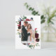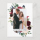 Carte de remerciement de photo de mariage de la mariée et du marié avec des fleurs de verdure à l'aquarelle élégante et burgundy rose comprend des roses burgundy et roses, des fleurs bleues, de la verdure botanique et des feuilles d'eucalyptus.