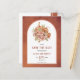 Fleurs en terre cuite et mariage de automne citrouille Enregistrer la carte postale Date. Ce joli design mariage dispose d'un cadre en arc sur arrière - plan taché de terre cuite. Dans le cadre, il y a un bouquet de fleurs en terre cuite et de citrouilles.