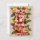 Il s'agit d'un dessin typographique coloré d'un verset biblique de l'Évangile selon saint Matthieu. Ce verset nous dit de lever tous nos fardeaux à Dieu et Il nous aidera à les porter. Le passage biblique est écrit dans un style de lettrage artistique et est en blanc. Derrière les mots se trouvent des fleurs de différentes tailles et formes, colorées de rouge, orange et jaune orangé. Il y a aussi des feuilles de différentes formes et de différentes tailles, dans les tons verts.