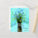 Carte postale des fleurs sauvages. La carte de photographie florale comporte des marguerites et des boutons d'or dans un vieux pichet en verre photographié et teinté de bleu. Le texte au recto dit "Je pense à toi" et au verso "et envoie une prière". Les deux zones sont sous forme de modèle pour une personnalisation facile. Convient comme carte de vœux de bon rétablissement ou d'encouragement.