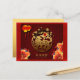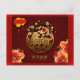 Design avec décoration florale traditionnelle chinoise + lanternes chinoises + papier Tigre doré coupé en position centrale avec une branche de pêche + "Bonne année" en anglais et chinois. Conception sur carte postale horizontale. Carte de voeux correspondante.