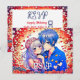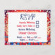 Cartes RSVP de mariage. Un garçon et une fille qui bouillonnent entouré de fleurs colorées. Mignonne couple anime, fille et garçon avec cheveux bleus. Les couleurs sont rouge, bleu, blanc.