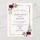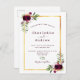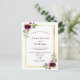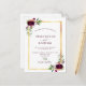Devant : Un arrière - plan blanc avec un cadre en faux or. Décoré de fleurs bordeaux foncé, de roses, de plumes de style boho et de verdure. Personnalisez et ajoutez vos noms et détails mariages. Retour : Carte postale. Cette carte est également disponible dans notre magasin avec la couleur arrière - plan bordeaux sur le dos.