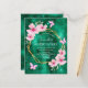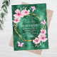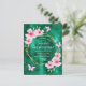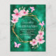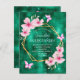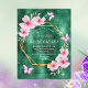 Une Quinceañera, 15e (ou tout âge) invitation de fête d'anniversaire avec fleurs d'hibiscus roses, verdure, papillons et un cadre géométrique en faux or. Un arrière - plan vert émeraude. Modèles pour un nom écrit avec un script moderne de style manuscrit, modèles pour vos informations de fête. Texte blanc.