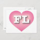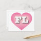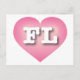Cette carte postale présente un coeur rose vif avec un centre blanc lavé contenant les lettres coques supérieures blanches en gras FL, l'abréviation officielle pour la Floride, l'état de soleil. Le verso de la carte postale est vide, en attendant vos sentiments manuscrits ou le texte customisé.