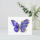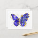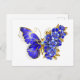 Jewelry, blue, sapphire, sparkling flower butterfly with wing decorated with blue, precious flowers with gold leaves on white background.