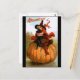 Une charmante carte d'Halloween vintage avec une jeune sorcière assise avec son chat noir sur un grand citrouille, peinte par l'illustratrice américaine Frances Brundage.