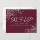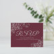 Ces belles cartes postales RSVP faciliteront la réponse de vos invités à votre faire-part de mariage avec soit le nombre de participants et une sélection de repas, ou d'envoyer leurs regrets. Le design est simple mais élégant avec du texte gris argenté et une bordure florale en fibre de faux feuille argent en dentelle sur un arrière - plan rouge vif ou bordeaux.