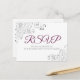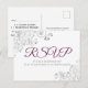Ces belles cartes postales RSVP faciliteront la réponse de vos invités à votre faire-part de mariage avec soit le nombre de participants et une sélection de repas, ou d'envoyer leurs regrets. Le design est simple mais élégant avec cassis violet ou magenta et gris texte et une bordure florale en filigree argentée en dentelle.