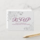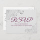 Ces belles cartes postales RSVP faciliteront la réponse de vos invités à votre faire-part de mariage et vous indiqueront leur choix de repas. La conception est simple mais élégante avec du texte de couleur mauve magenta ou cassis et une bordure florale de faux feuille argent en dentelle sur un arrière - plan gris clair.