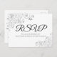 Ces belles cartes postales RSVP faciliteront la réponse de vos invités à votre faire-part de mariage avec soit le nombre de participants et une sélection de repas, ou d'envoyer leurs regrets. Le design est simple mais élégant avec du texte noir et gris et une bordure florale en fibre de feuille argent en dentelle sur un arrière - plan blanc.