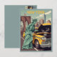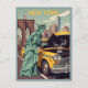 This amusing WPA‑inspired New York postcard captures the Statue of Liberty as a humanesque figure stepping off her plinth and getting hands‑on with city life. Spanner in hand, she leans over the open engine bay of a broken‑down New York yellow cab stranded on the Brooklyn Bridge, turning an everyday mishap into a playful slice of urban folklore.