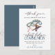 Élégante carte de remerciement pour garçon religieux pour sa Première Sainte Communion. Le design présente une croix à l'aquarelle, une icône de Bible Sainte et de chapelet de couleur bleue, une typographie script ''première sainte communion'' et ''merci'' en lettrage moderne sur fond blanc. Personnalisez avec un nom.
