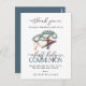 Élégante, carte de remerciement de Première Sainte Communion pour garçon religieux. Le design présente une croix aquarelle, une icône de chapelet et de Sainte Bible en couleur bleue, une typographie script ''première sainte communion'' et ''merci'' en lettrage moderne sur fond blanc. Personnalisez avec un nom.