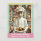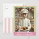 Carte postale avec une esthétique pastel artistique comportant une illustration unique d'un petit garçon présentant une assiette de délicieux mets gastronomiques et de friandises.