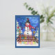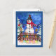 Un tableau d'aquarelle de Sandra Gale d'un neigeur traditionnel debout devant une clôture de piquetage avec des lumières de Noël brillantes reflétant la neige d'hiver. Oiseaux, maisons d'oiseaux et ornements de Noël en font une scène de Noël classique qui a l'air bien sur papier d'emballage, carte de fin de année et plus !