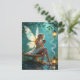 Une carte postale sucrée pour rester en contact avec des amis et des membres de la famille avec une fée assise sur une msurhoom dans une forêt enchantée éclairée par des lanternes buvant une tasse de café chaude.