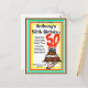 Invitation à personnaliser comme vous le souhaitez pour une fête d'anniversaire 50 ans. Un délicieux gâteau d'anniversaire au chocolat à trois étages en feu avec 50 bougies d'anniversaire. Combinaison de couleurs rétro marron, orange brûlé, turquoise et jaune pour une ambiance des années 1970.