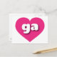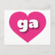 Cette carte postale est dotée d'un coeur rose chaud et vibrant, contenant la ga des lettres coques inférieures, audacieuses, blanches et arrondies, une abréviation ludique pour la Géorgie, l'état de pêche. Le verso de la carte postale est vide, en attendant vos sentiments manuscrits ou le texte personnalisé.